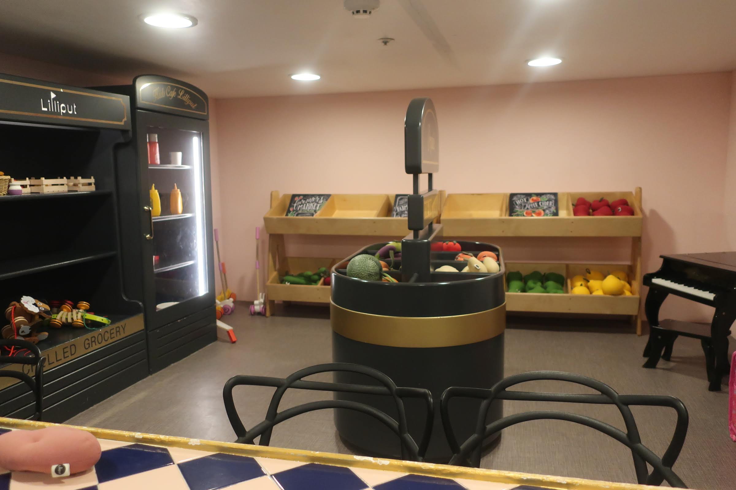 키즈카페의 단골 아이템 립프로그 아이스크림 카트와 미니 유모차도 있습니다. 한쪽에는 음료바가 있는데 어른은 1인은 1음료 주문이 필수입니다.