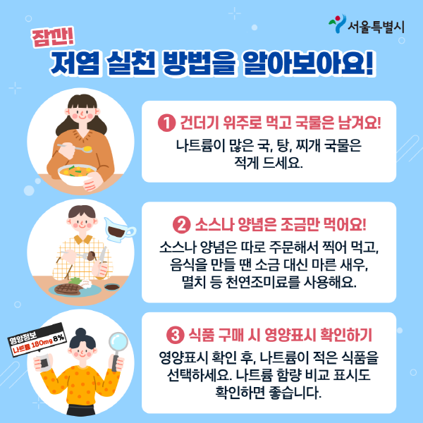 국, 탕, 찌개는 건더기 위주로 먹기, 국물은 남겨요 ~ 소스나 양념은 따로 먹기 부먹 보다는 찍먹 ~ 영양표시 확인하고 나트륨 함량 적은 식품 골라요~