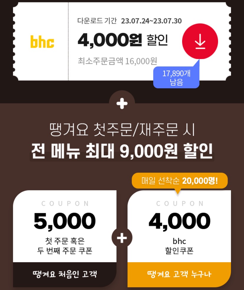 땡겨요 첫 주문 쿠폰과 BHC 할인 쿠폰을 다운받습니다.