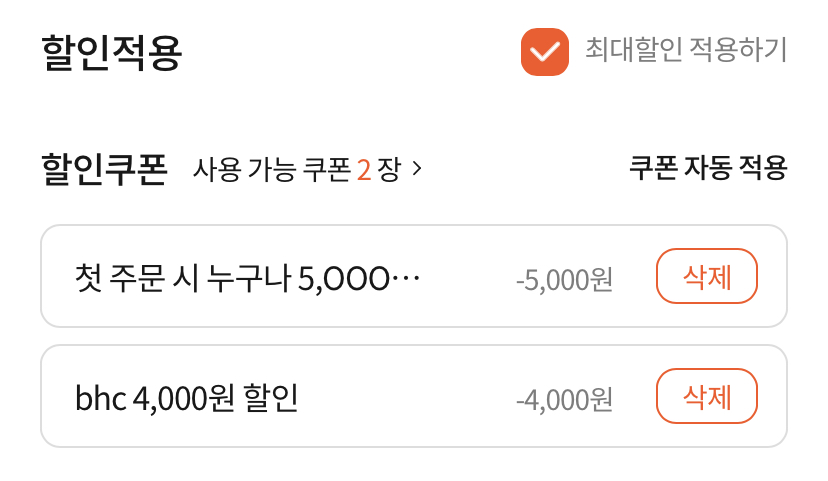 쿠폰 덕분에 9천원 할인 혜택을 적용하여 괜찮은 가격에 치킨 배달 주문을 할 수 있었습니다.
