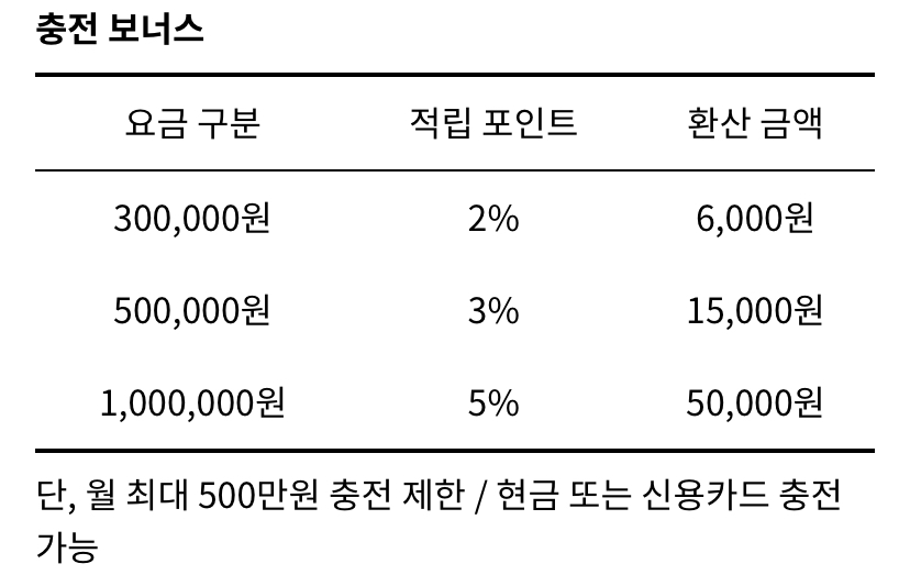 단, 월 최대 500만원 충전 제한 / 현금 또는 신용카드 충전 가능