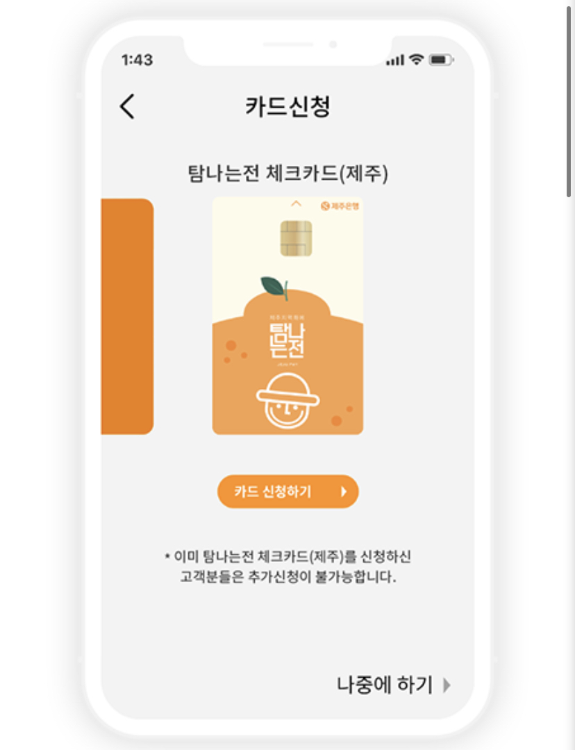 - 온라인 신청 : 탐나는전 앱에서 '탐나는전 체크카드(제주)'를 선택 후 신청 ▷ 앱 메인화면에 '카드등록' 선택 ▷ 앱에서 카드 관리