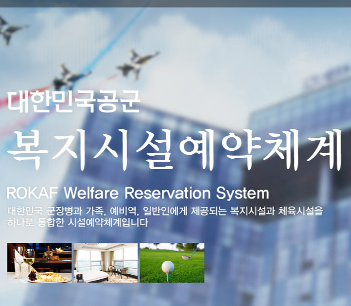 공군 복지시설 예약체계는 군장병과 가족, 예비역, 일반인에게 제공되는 복지시설과 체육시설을 하나로 통합한 시설예약체계입니다.