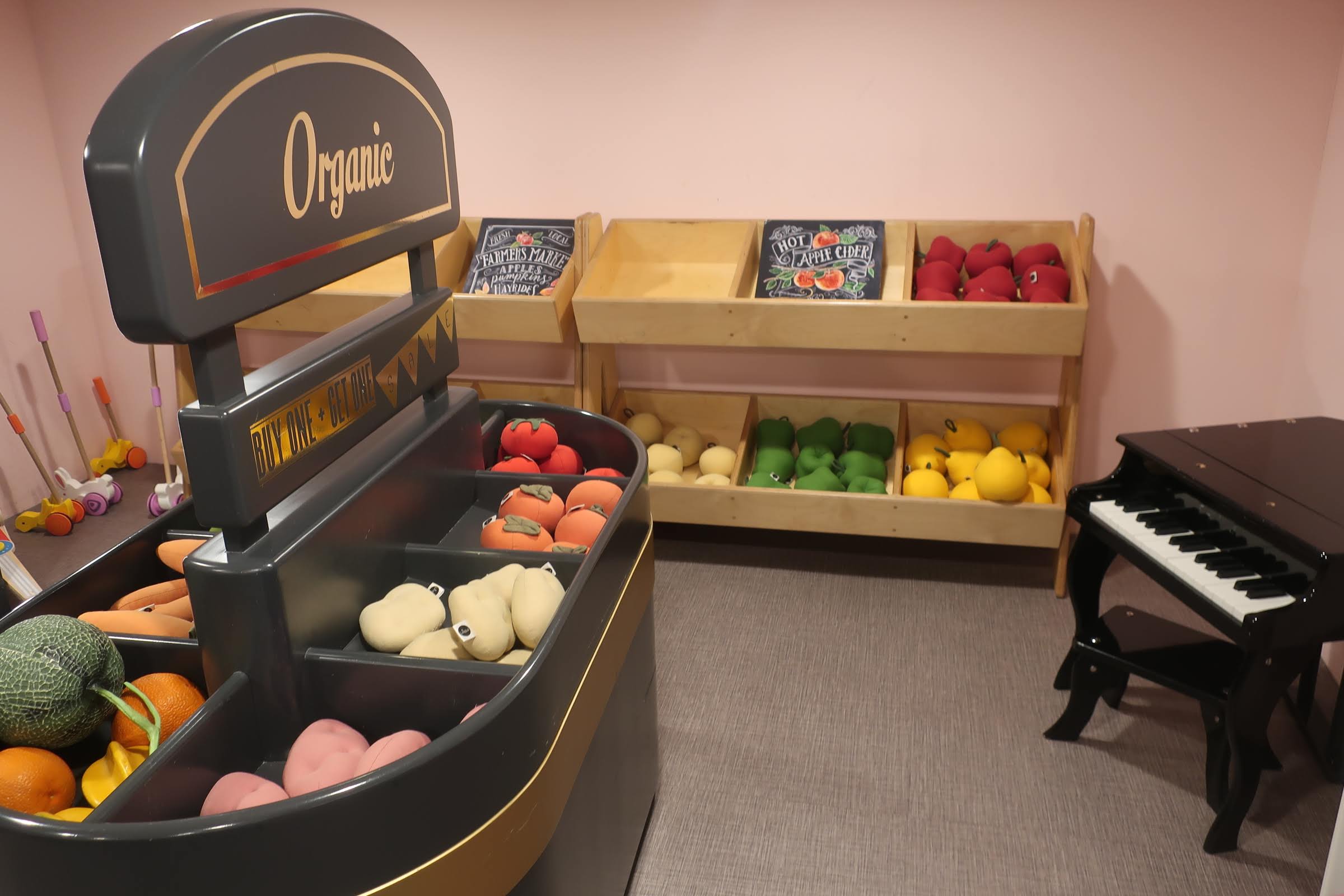 안쪽에는 말랑말랑한 과일 채소 모형과 미니 피아노가 있습니다. 이 미니 피아노는 소리도 난답니다.