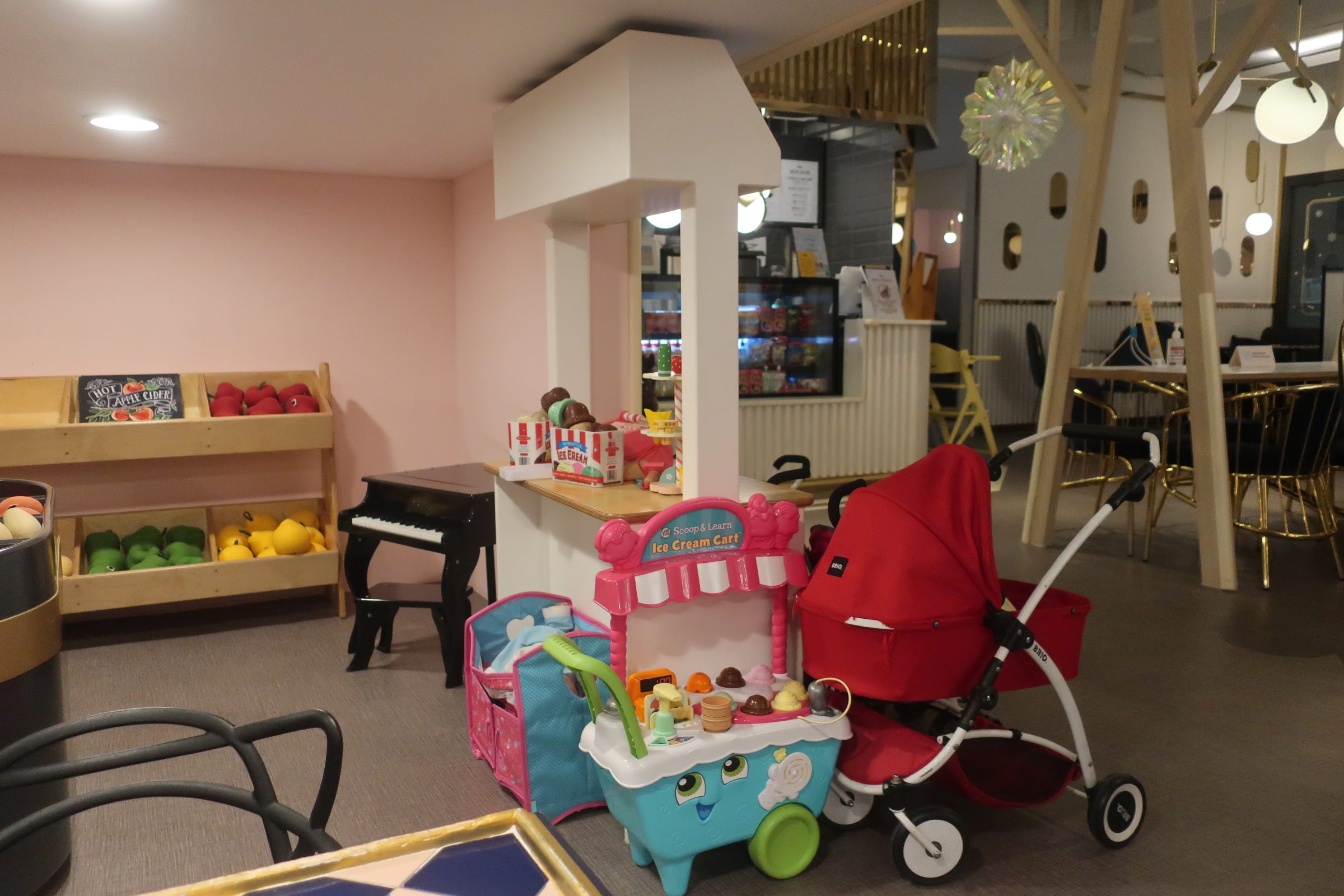 키즈카페의 단골 아이템 립프로그 아이스크림 카트와 미니 유모차도 있습니다. 한쪽에는 음료바가 있는데 어른은 1인은 1음료 주문이 필수입니다.