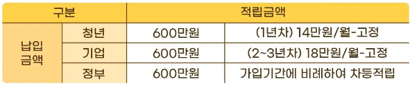 부금 납입 : 청년 근로자, 중소기업, 정부가 동일 비율(3년간 600만원)로 공동 적립