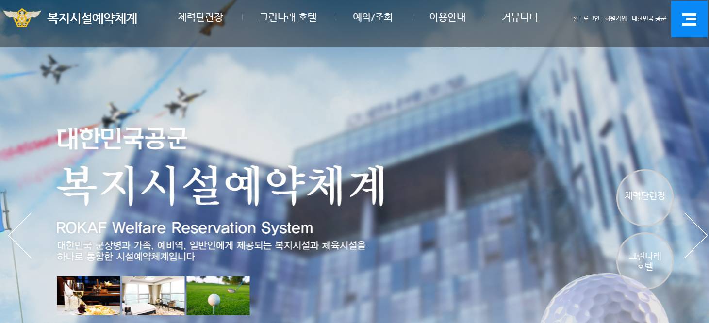 공군 복지시설 예약체계는 군장병과 가족, 예비역, 일반인에게 제공되는 복지시설과 체육시설을 하나로 통합한 시설예약체계입니다.